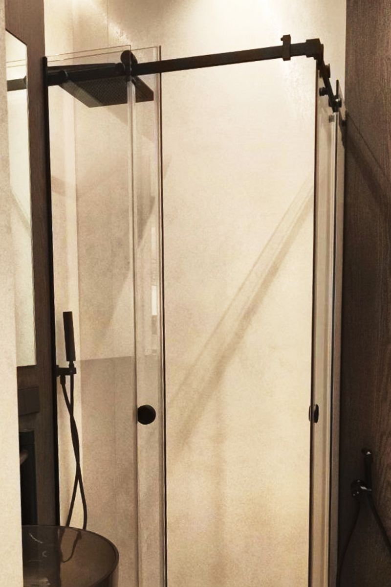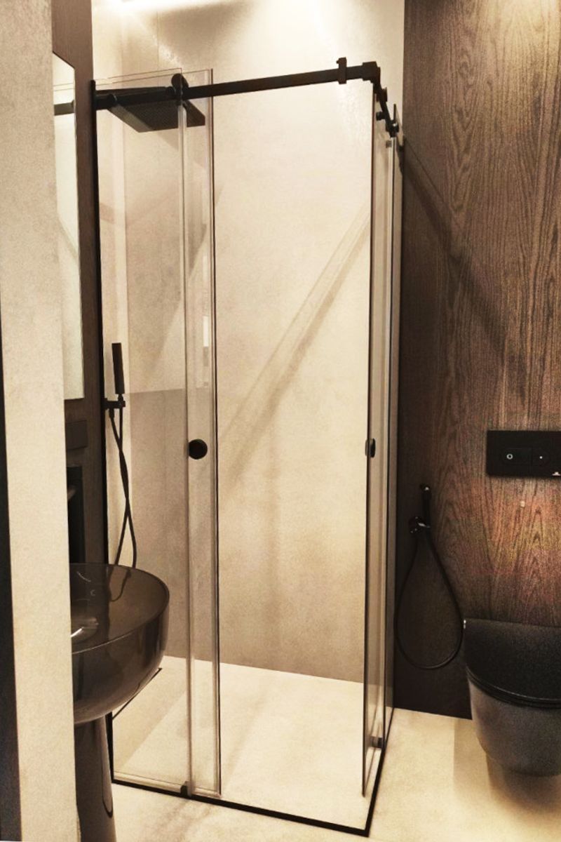 В Дизайн-Стекло создали надежное и компактное решение для интерьера ванной комнаты — душевое ограждение, изготовленное из прочного закаленного осветленного стекла толщиной 8 мм с применением элегантной чёрной фурнитуры.