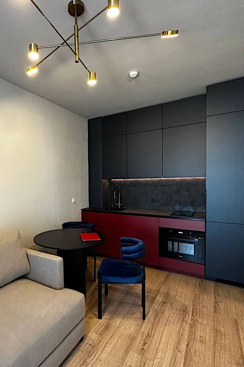 Кухня в глубоком сером цвете для квартиры дизайнера интерьеров